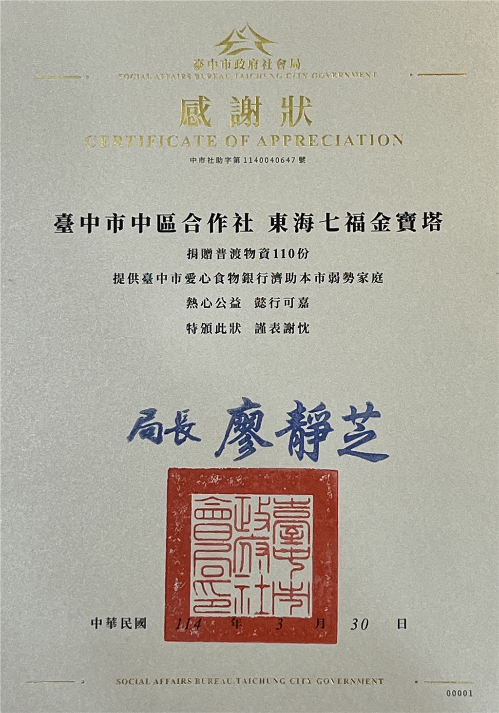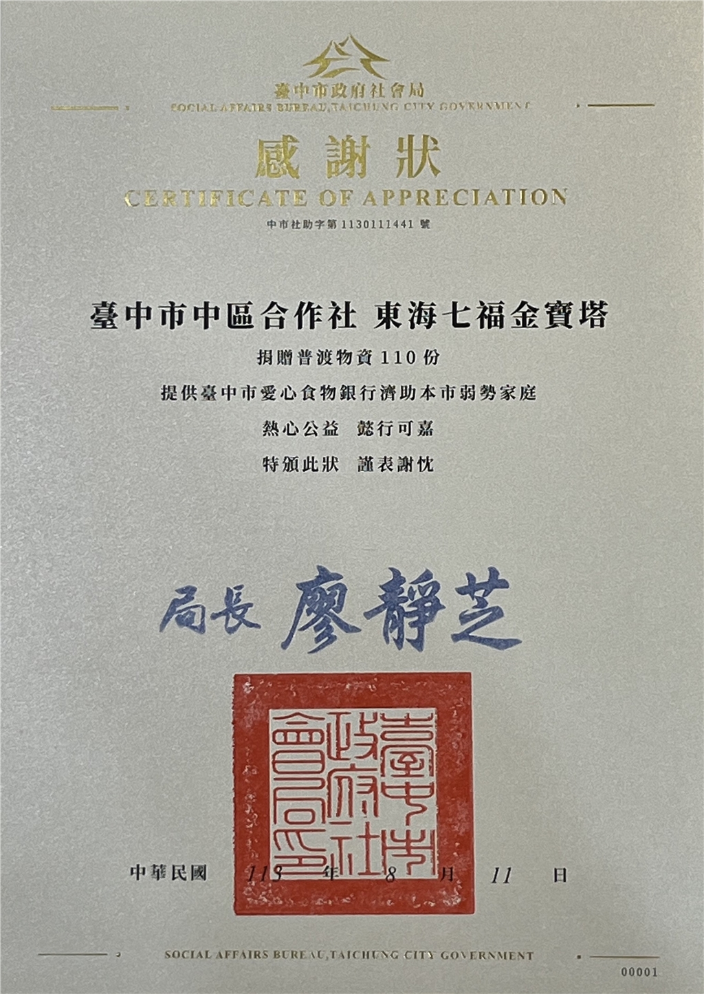 內政部獎狀
