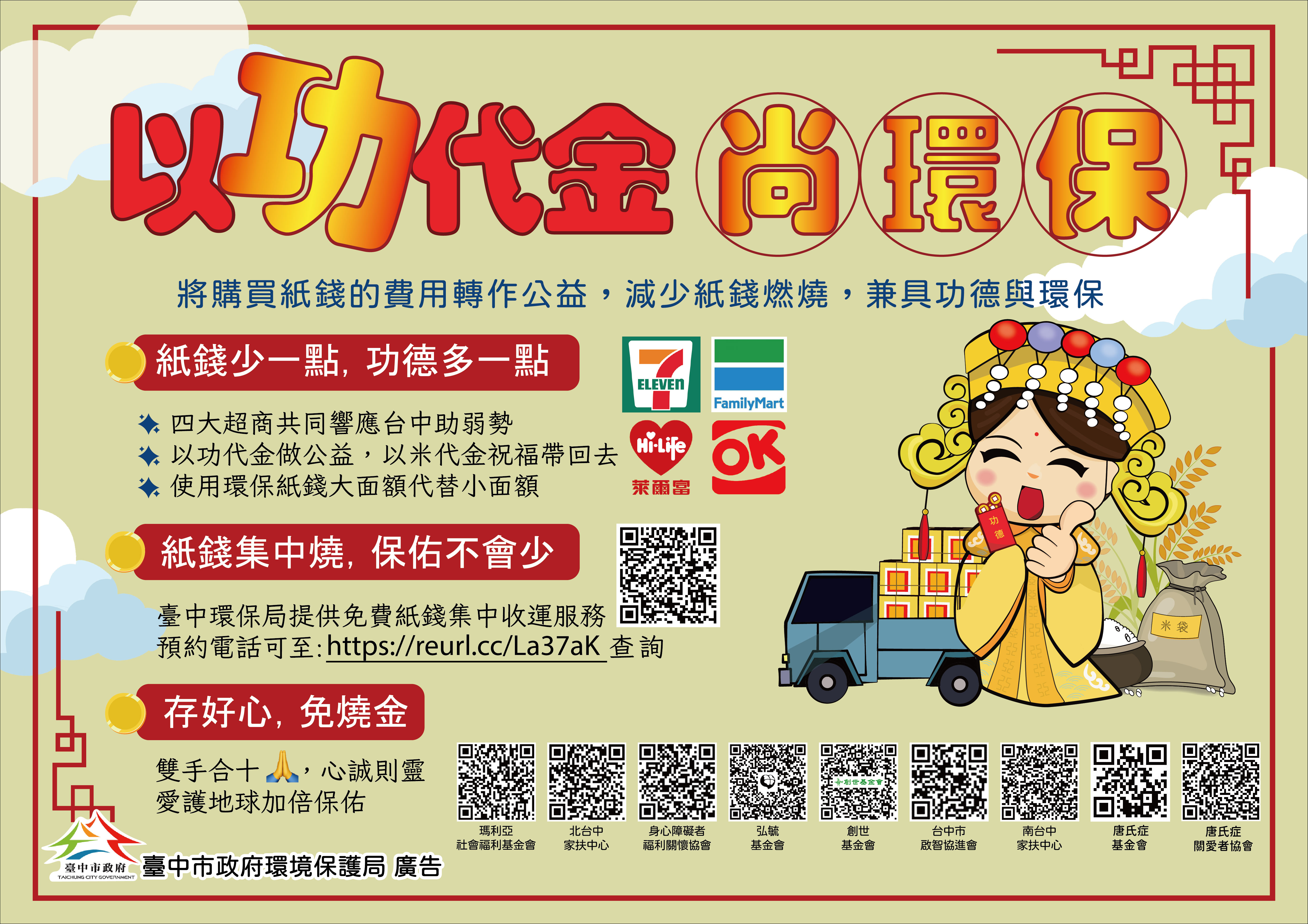 2.「環保祭祀」不但可以減少因焚燒紙錢所造成的空氣污染,也可避免火災等公安意外的發生,為鼓勵民眾不燒紙錢,將購買紙錢的費用改採環保公益「以功代金」的方式捐款幫助弱勢團體,也就是透過附件海報,用手機掃描QR-CODE隨手做公益,或前往四大超商平台事務機之代收操作方式,選擇「台中以功代金」,讓傳統焚燒紙錢所造成的空氣污染行為改為愛心捐款添福報且對環境友善的方式進行祭祀,讓市民朋友共添福氣與功德。