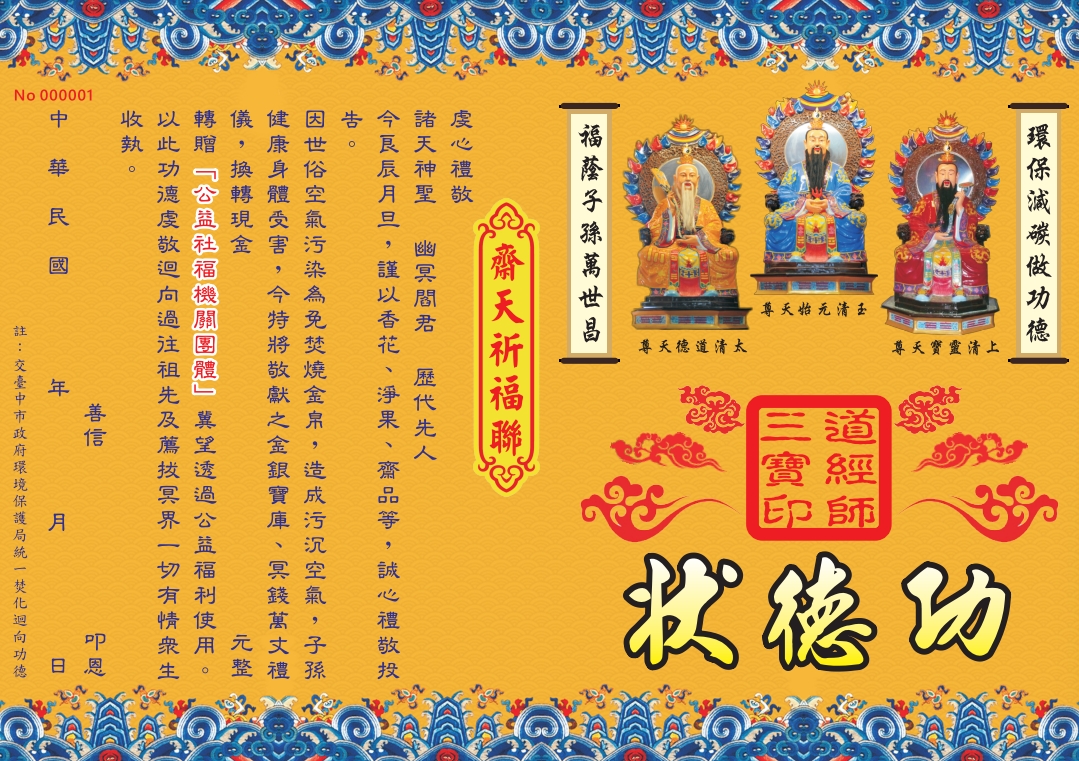4.「以功代金」的善舉亦可同步下載功德狀,除了可以助弱勢、耕福田,同時也可以積福德、降空污;相關疏文內容之需求,以及四大超商「以功代金」代收操作流程,可至環保局紙錢減污網站(網址:https://www.epb.taichung.gov.tw/2938692/post)下載查詢。
